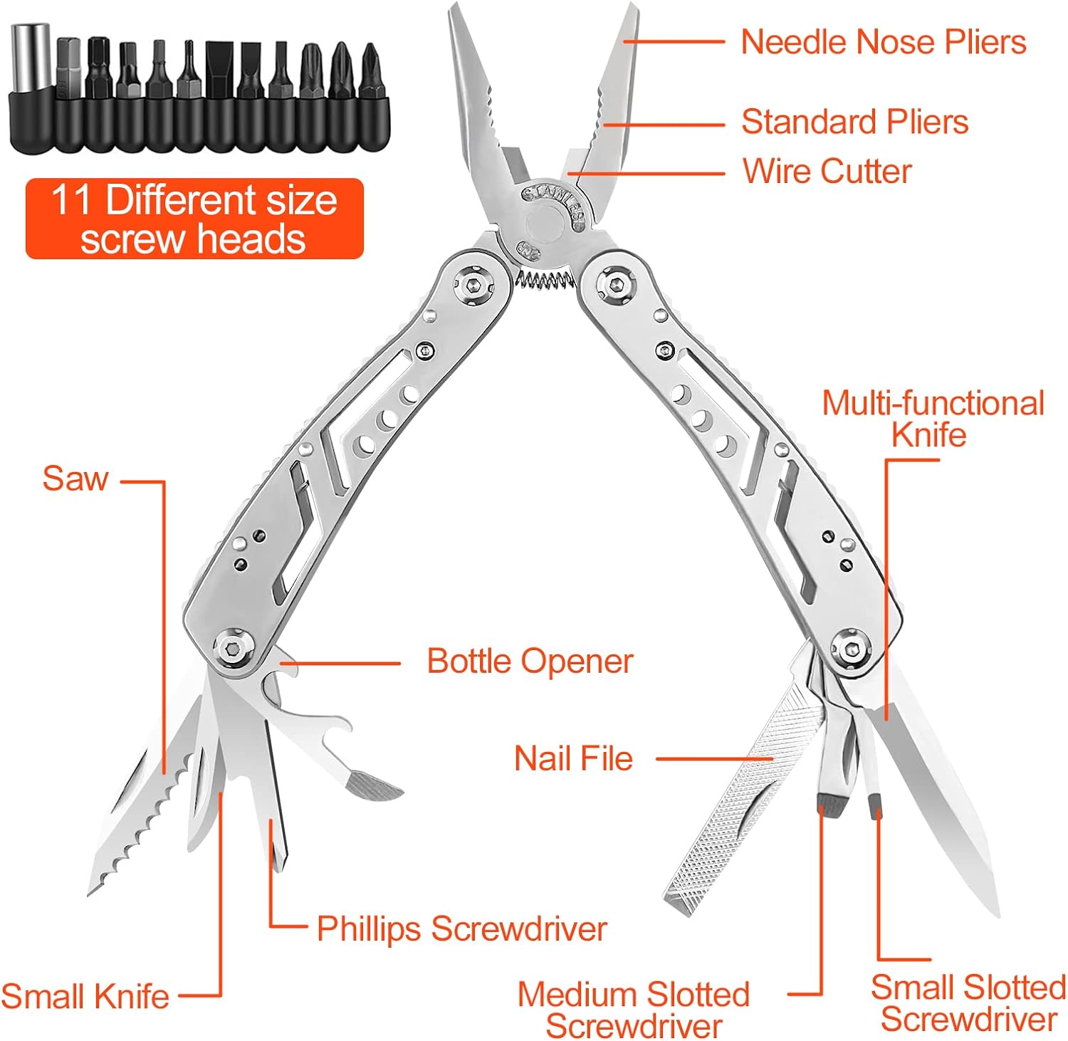 La pinza multiuso include pinze ad ago, pinze standard, tagliacavi, apribottiglie, cacciaviti Phillips, coltello, sega, coltelli multifunzione, cacciavite a lama piatta piccolo, cacciavite a lama piatta media, lima. È inoltre dotato di 11 punte per cacciavite di dimensioni diverse, sufficienti per soddisfare le esigenze di diversi scenari.